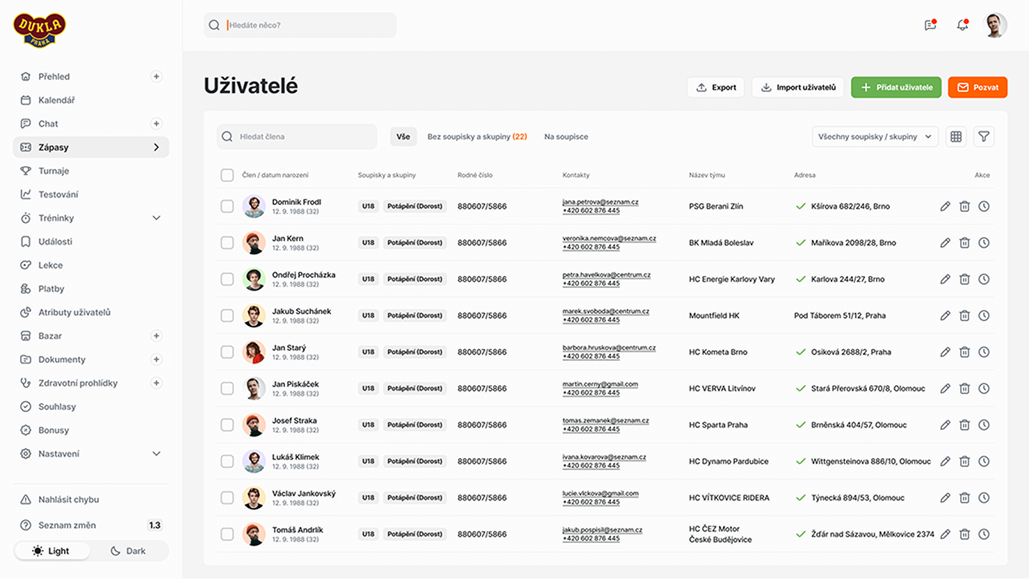 - BONUSY – Online správa dresů a klíčů, možnost zažádat o dres a objednat rovnou i velikost.
